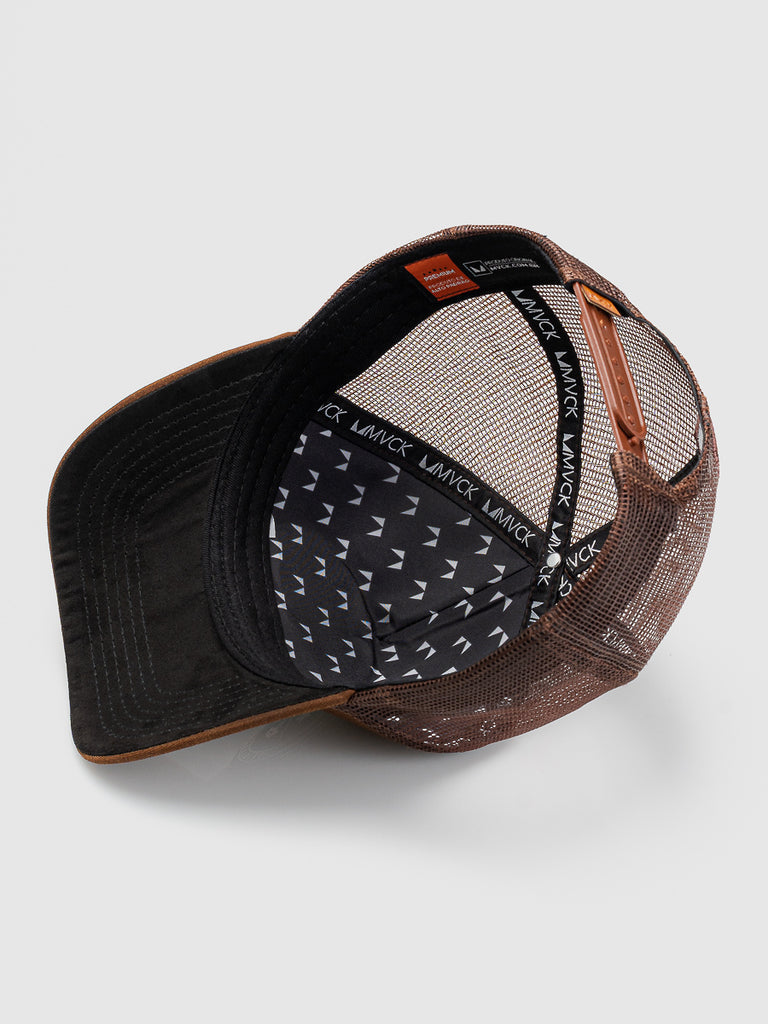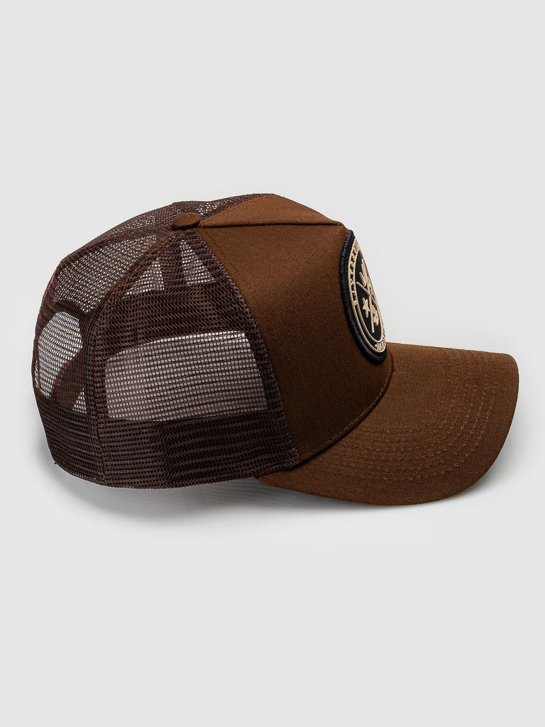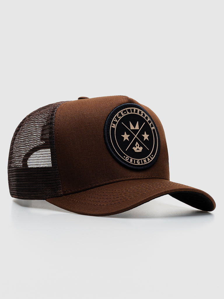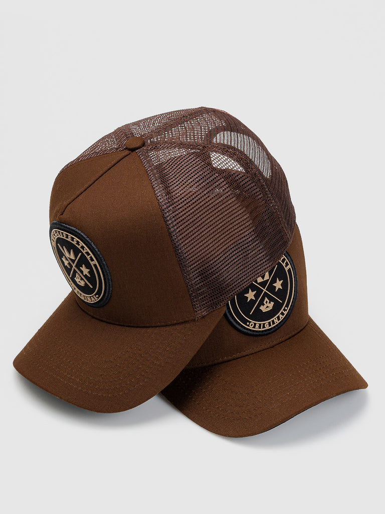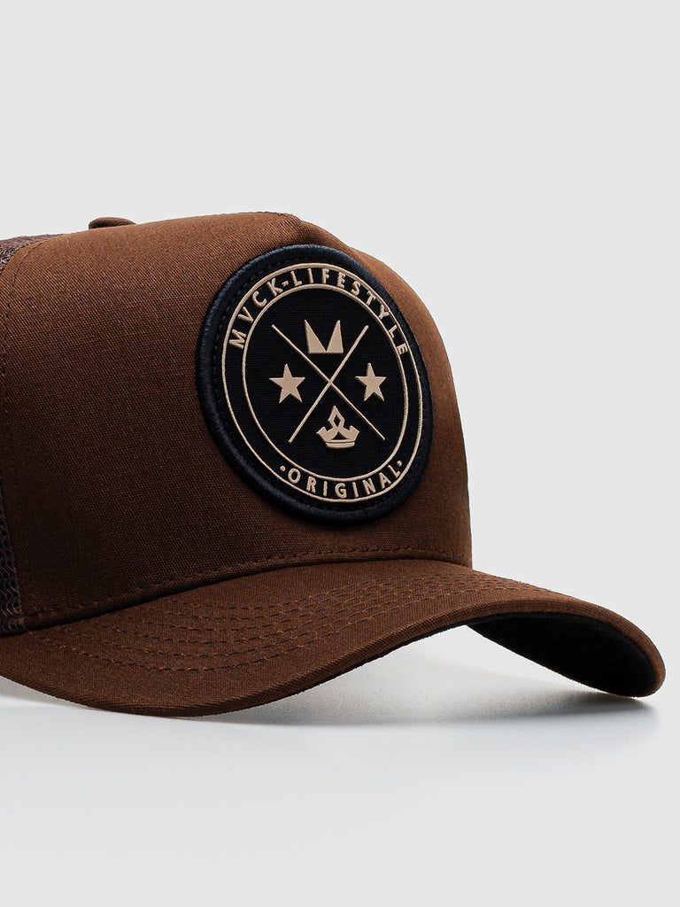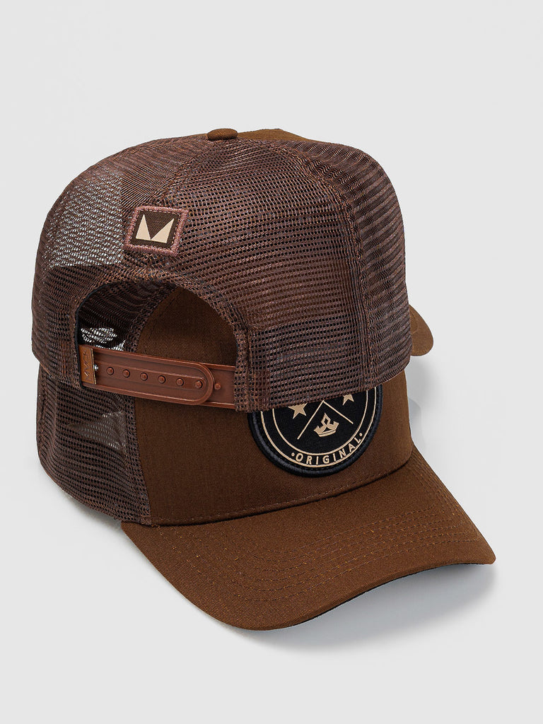 Logo emborrachada sobreposta ao boné com acabamento premium.