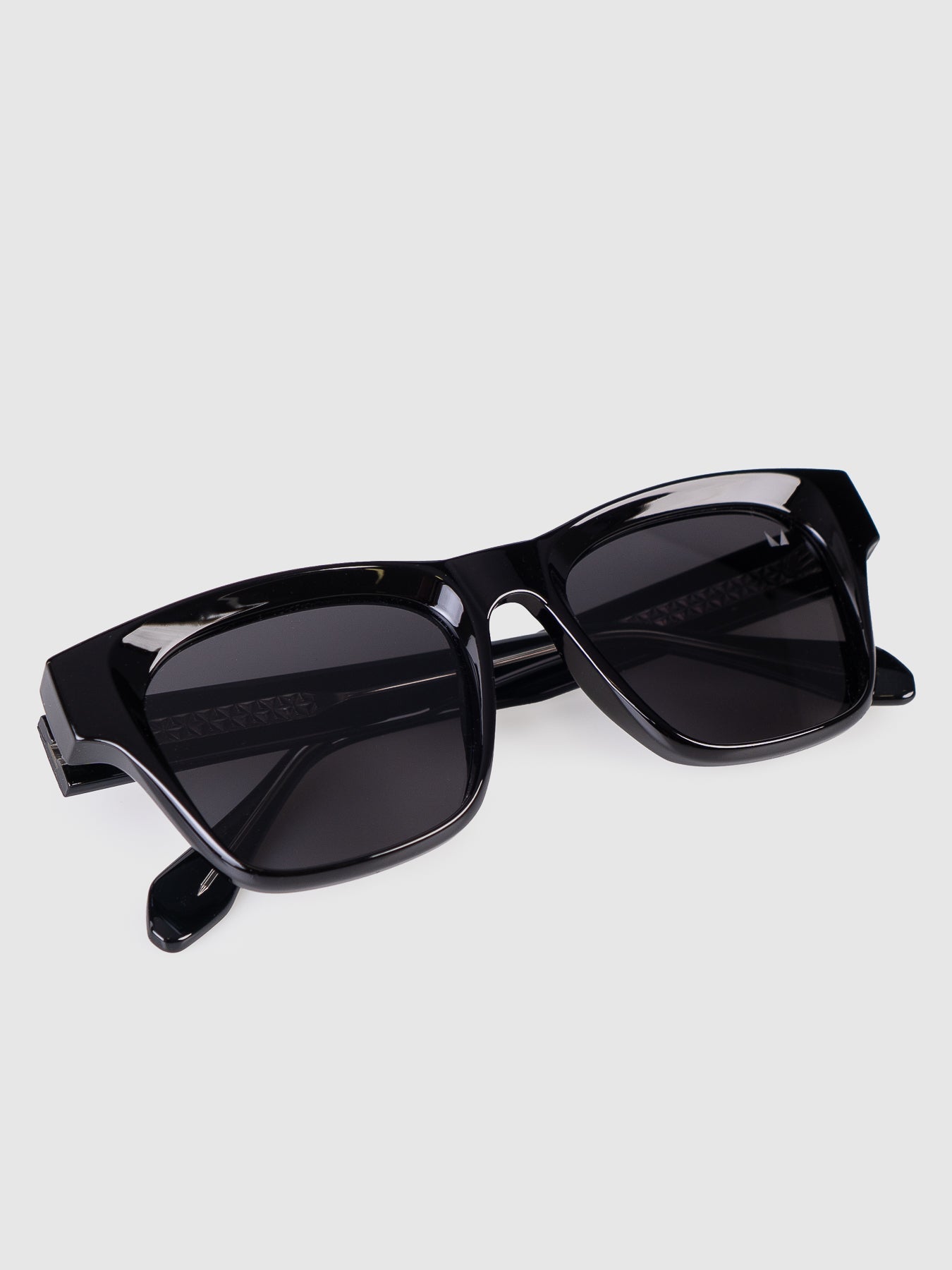 Possui armação em acetato com lentes pretas polarizadas e proteção aos raios UV.