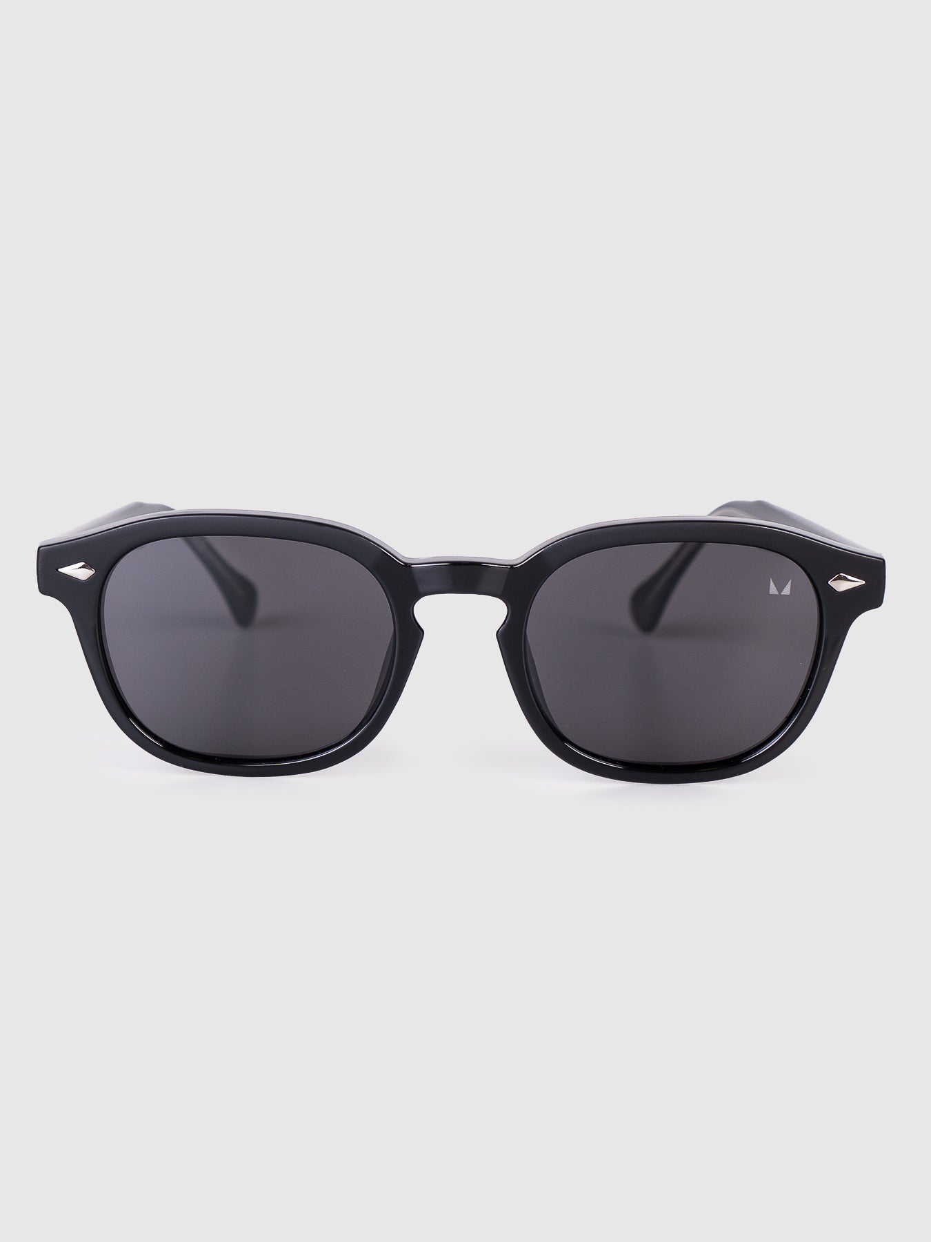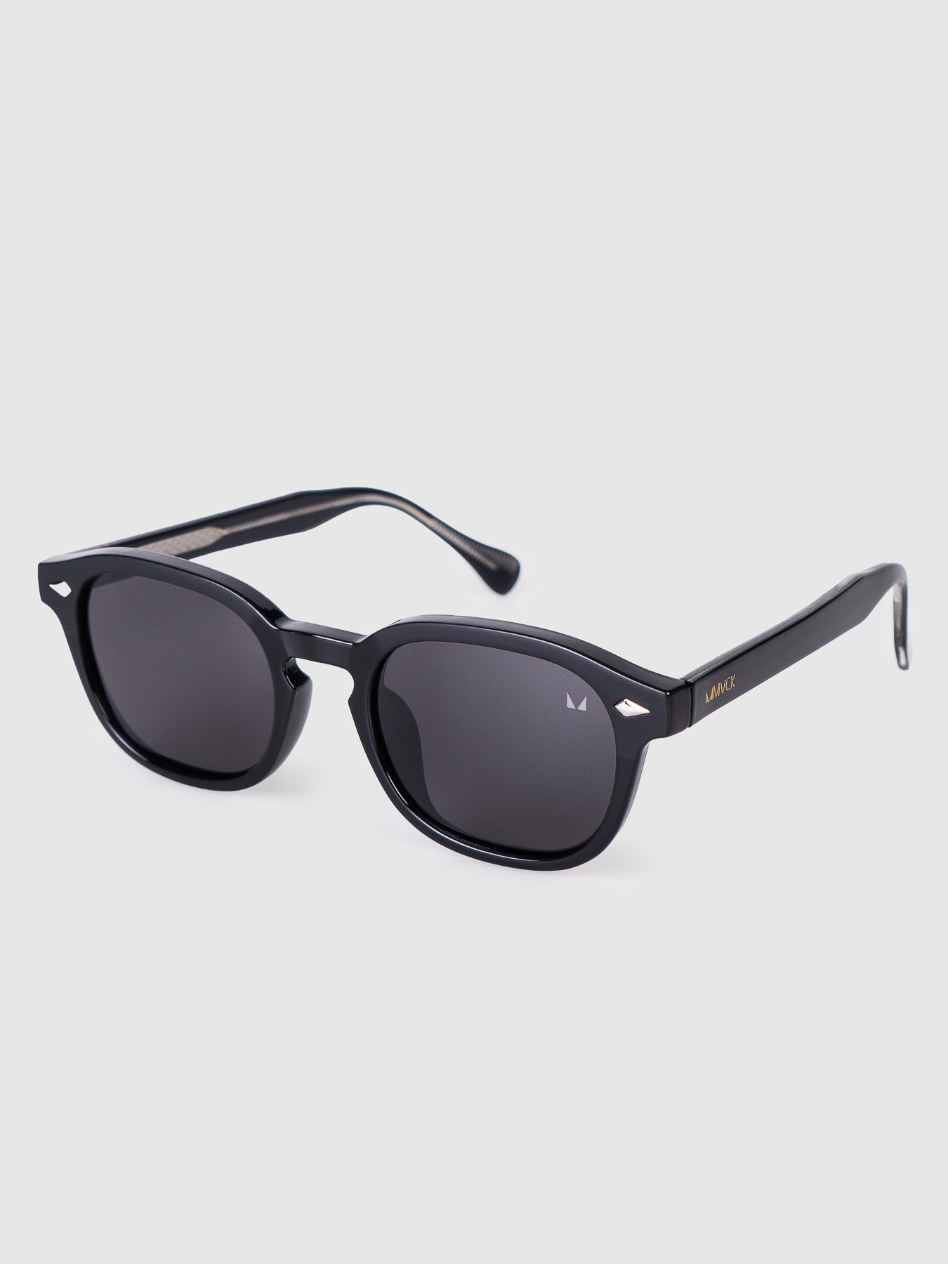 Possui armação em acetato com lentes pretas polarizadas e proteção aos raios UV.